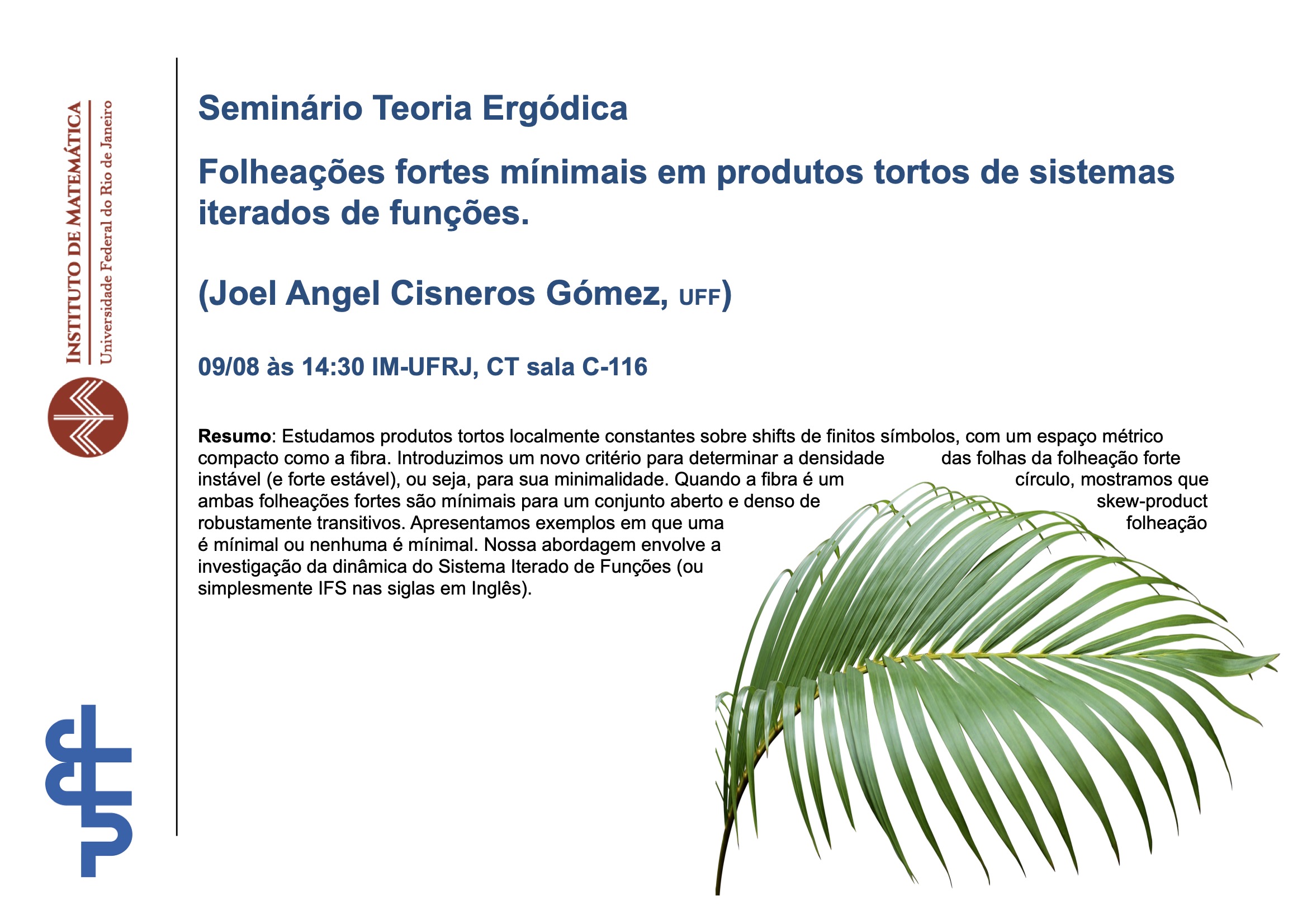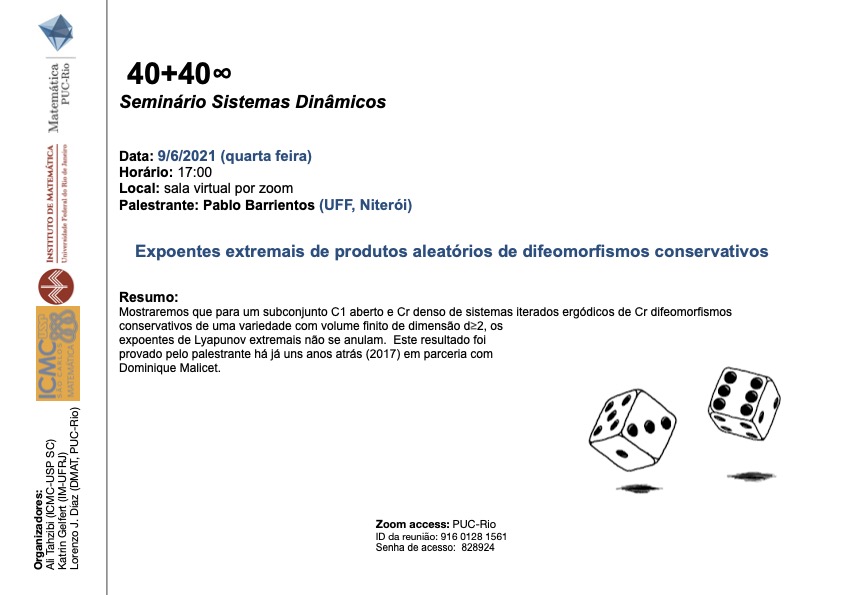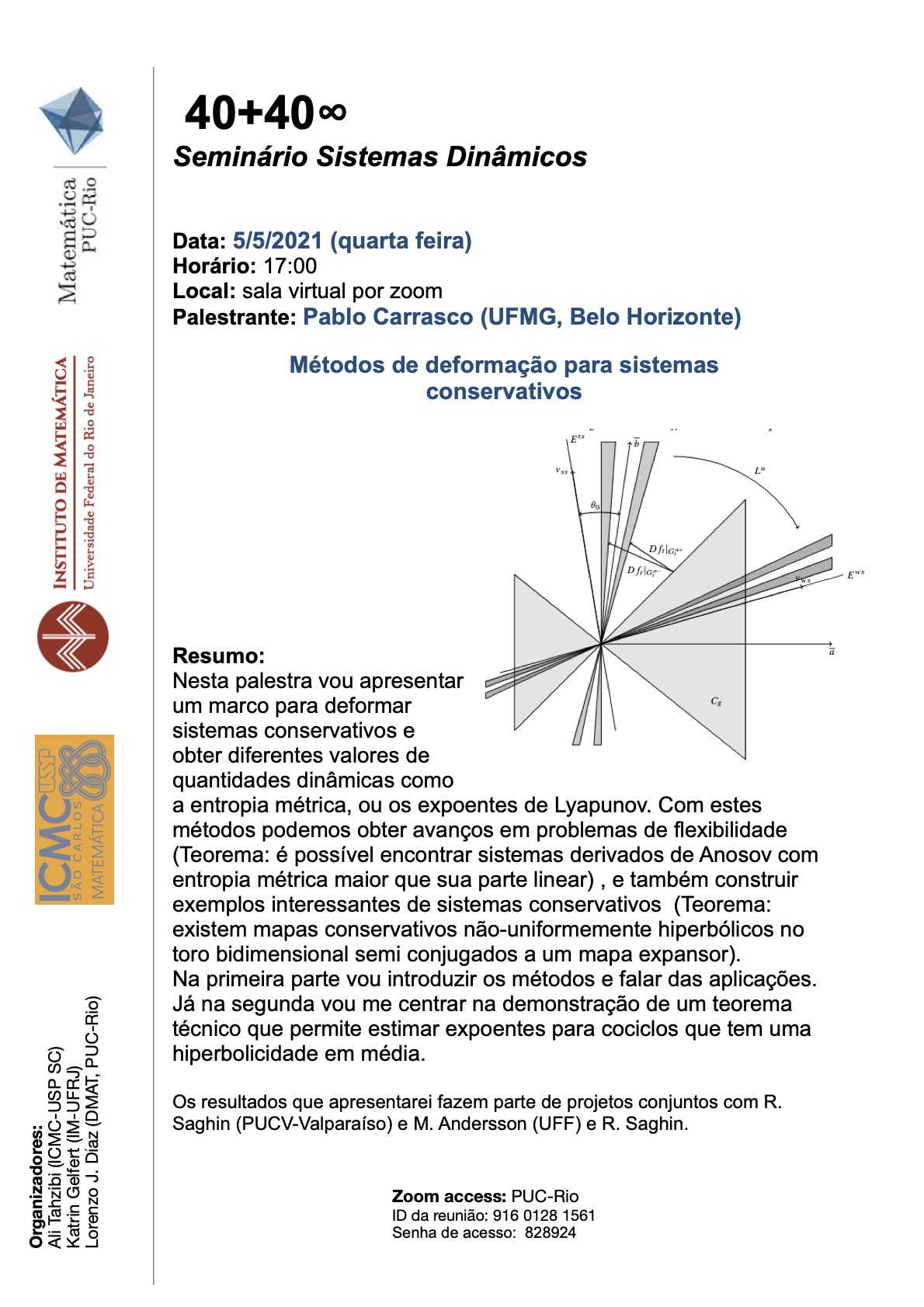Seminário do Grupo de Sistemas Dinâmicos (IM-UFRJ) 6/12/2023 16h00: Pablo Barrientos t.b.a. 22/11/2023 16h00: Rafael Pereira (UFMG) Dimensão box-counting de gráficos fractais 18/10/2023 16h00: Rafael Ruggiero (PUC-Rio) Fatores expansivos de fluxos geodésicos em variedades sem pontos conjugados de visibilidade e suporte total da medida de máxima entropia 13/09/2023 16h00: Martin Andersson (UFF) Endomorfismos não uniformemente hiperbólicos em dimensão dois 30/08/2023 16h00: Victor Janeiro (UFMG) Robust non-uniformly hyperbolic endomorphisms 23/08/2023 16h00: Michal Rams (IM PAN, Varsóvia) Weighted Cesaro averages 09/08/2023 14h30: Joel Angel Cisneros Gómez (UFF) Foliações fortes mínimais em produtos tortos de sistemas iterados de funções 16h00: Dominique Malicet (Université Gustave Eiffel) Spectral properties and limit theorems for (mostly) contracting random dynamical systems 20/07/2022 Richard Becerra (ICMC-USP) Sistemas de Medidas Margulis e medidas de máxima entropia para Difeomorfismos Parcialmente Hiperbólicos com Folheação central compacta 22/06/2022 Ao Cai (PUC-Rio) Furstenberg theory of mixed random-quasiperiodic cocycles 18/5/2022 Klaudiusz Czudek (Uniwersytet Mikołaja Kopernika Torun (Polônia)) The central limit theorem for random rotations 6/5/2022 Sergi Burniol Clotet (Université Sorbonne, IMJ-PRG, França) Unique ergodicity of the horocyclic flow of certain surfaces without conjugate points 23/6/2021 Seminário 40+40oo (com USP-SC e PUC-Rio) Sébastien Biebler (Université Sorbonne, IMJ-PRG, França) Blenders and almost blenders 9/6/2021 Seminário 40+40oo (com USP-SC e PUC-Rio) Pablo Barrientos (UFF, Niteroi) Expoentes extremais de produtos aleatórios de difeomorfismos conservativos 5/5/2021 Seminário 40+40oo (com USP-SC e PUC-Rio) Pablo Carrasco (UFMG, Belo Horizonte) Métodos de deformação para sistemas conservativos 25/11/2020 Maria Joana Torres (Universidade do Minho) 18/11/2020 Nataliya Goncharuk e Yury Kudryashov (University of Toronto) • Structurally unstable families of planar vector fields 04/11/2020 Edgar Matias (UFBA) • Iterações aleatórias Markovianas de homeomorfismo no círculo 21/10/2020 Jonas Deré (KU Leuven Kula, Kortrjik, Belgium) • Which manifolds admit expanding maps? 23/09/2020 Khadim War (IMPA) • Closed Geodesics on Surfaces without Conjugate Points 09/09/2020 Gabriela Alexandra Estevez Jacint (IM-UFRJ) • Some recent results on multicritical circle maps 04/03/2020 Felipe Riquelme (PUCV, Valparaiso, Chile) • Non-convergence of equilibrium states at zero temperature for geodesic flows 13/11/2019 Katrin Gelfert (UFRJ) • Expoentes de Lyapunov de cociclos 30/10/2019 Bruno Santiago (UFF) • Aproximação de medidas ergódicas por ferraduras no cenário parcialmente hiperbólicos 16/10/2019 Isaia Nisoli (UFRJ) • Noise induced order and non-uniformly hyperbolic dynamics Manuel Stadlbauer (UFRJ) • Bordo de Martin, formalismo termodinâmico e grupos hiperbólicos 25/09/2019 Maria Jose Pacifico (UFRJ) • Up, down, two-sided Lorenz attractor, collisions, merging and switching 11/09/2019 Luciana Salgado (UFRJ) • Certas propriedades dinâmicas para fluxos singulares e suas caraterizações 04/09/2019 Fernando Lenarduzzi (IMPA) • Difeomorfismos Fortemente Dissipativos 28/08/2019 Adriana da Luz (UFRJ) • Decomposição dominada para fluxos singulares 21/08/2019 Nilson Bernardes (UFRJ) • Sombreamento e Estabilidade Estrutural em Sistemas Dinâmicos Lineares 26/06/2019 Jaqueline Siqueira (UFRJ) • Estados de equilíbrio para aplicações não-uniformemente hiperbólicas: propriedades estatísticas, continuidade conjunta e analiticidade com respeito ao potencial 12/06/2019 Khadim War (IMPA) • Open sets of exponentially mixing Anosov flows 05/06/2019 Michał Rams (IM PAN, Varsóvia (Polônia)) • Projections of fractal percolations 24/04/2019 Maryam Hosseini (Institute for Research in Fundamental Sciences, Teerã (Irã)) • Dimension Group and Cantor Minimal Systems 17/04/2019 Catalina Freijo (IMPA) • Continuidade dos expoentes de Lyapunov para cociclos lineares com uma única holonomia. 27/03/2019 Regis Varão (Unicamp) • Rigidez de medidas para certas ações. 20/03/2019 Alex Zamudio (UFRJ) • Dimensão de Hausdorff para projeções de conjuntos de Cantor complexos dinamicamente definidos 05/12/2018 Ricardo Bioni Liberalquino (UFRJ) • Sistemas dinâmicos com ruído: uma abordagem computacional 24/10/2018 Shintaro Suzuki (UFBA) • A relative Ruelle-Peron-Frobenius theorem for random non-uniformly expanding maps 26/09/2018 Samuel Senti (UFRJ) • Sobre esquemas de indução no estudo das propriedades ergódicas de sistemas dinâmicos 05/09/2018 Ali Tahzibi (USP - São Carlos) • Expoentes de Lyapunov, continuidade absoluta, Rigidez de Difeomorfismos de Anosov e nossos sonhos 15/09/2018 Woochul Jung (Chungnam National University, Daejeon, South Korea) • On periodic orbits in the Gromov-Hausdorff space of continuous maps 22/08/2018 Xuan Zhang (IM-UFRJ) • Flutuação de soma ergodica por specificação 29/08/2018 Dominik Kwietniak (Jagiellonian University in Krakow) • Borel complexity of normal numbers via generic points in subshifts with specification |