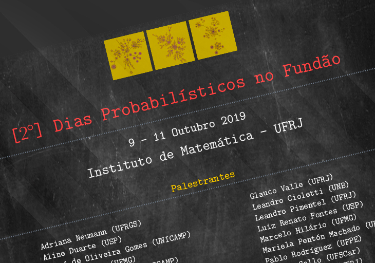 "Dias Probabilísticos no Fundão" é um encontro na área de probabilidade que ocorre na sala C-116 do Instituto de Matemática entre os dias 9 e 11 de outubro de 2019. O evento está em sua segunda edição, tendo a primeira ocorrido em setembro de 2015. Ele ocorre no âmbito do projeto "Sistemas estocásticos: limites em escala e transições de fase" desenvolvido com apoio da FAPERJ (E-26/203.048/2016). Assim como na edição passada o evento reunirá pesquisadores atuando em diversas subáreas da probabilidade e terá 18 palestras abertas a todo o público interessado. O objetivo é promover uma forte interação entre pesquisadores, alunos de graduação e alunos pós-graduação, estimulando o debate e discussão sobre temas atuais e relevantes em probabilidade e processos estocásticos.