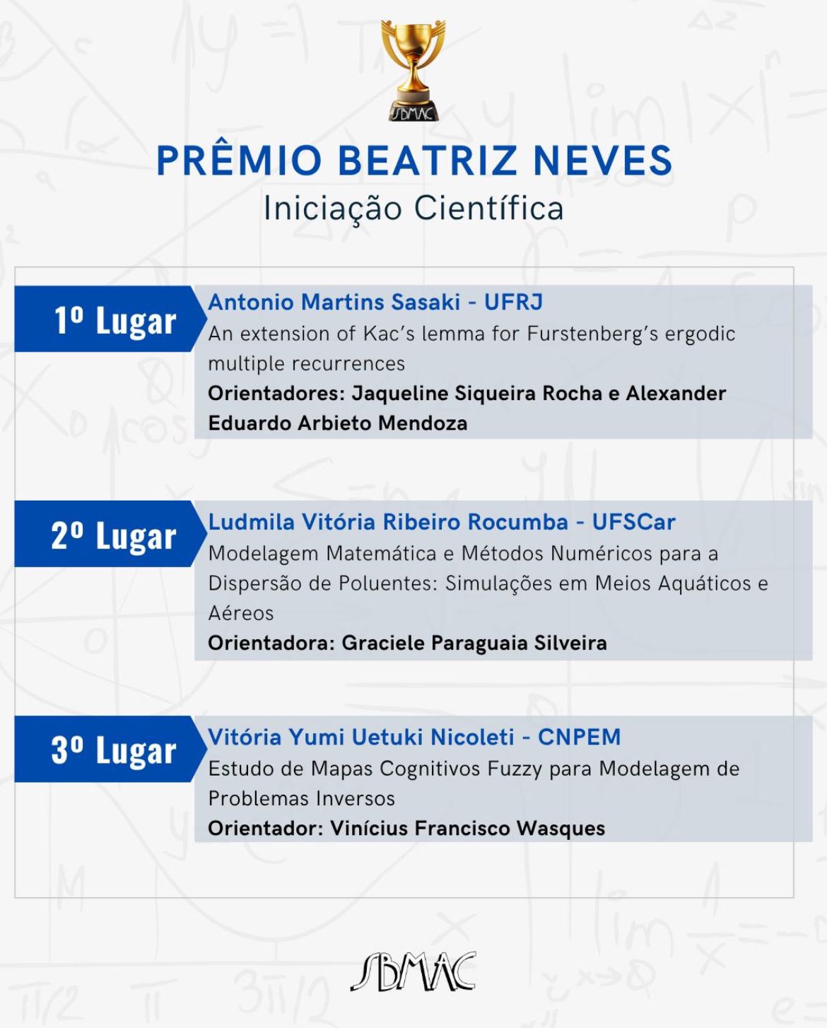 É com muita alegria que celebramos o 1º lugar no Prêmio Beatriz Neves de Iniciação Científica da SBMAC! 🎉